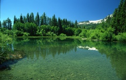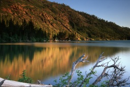 The first rays of sunlight crawl up Alpine Springs at its outlet into Fallen Leaf Lake, one of the wonders of nature near Lake Tahoe in the Sierra Mountains.
