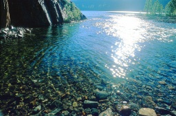 Only a few feet upstream from the outlet the water catches the light and turns it into an impressionist painting as it flows over the rocky riverbed.