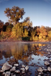 An unusually quiet dawn at Barking Dog Rapid on the American River near Coloma, California--heart of the Gold Country. Later in the day the water will be raging over the rocks and the whitewater rafters will be out in force.